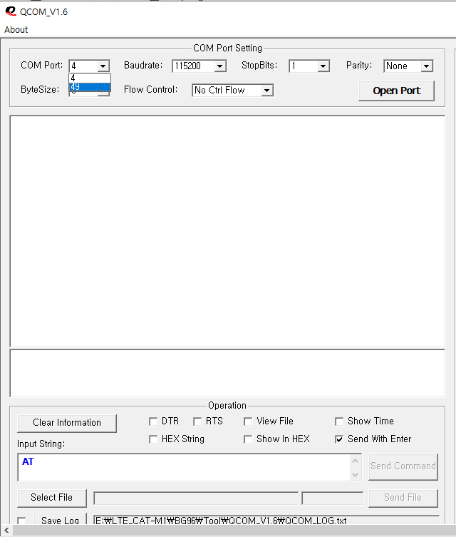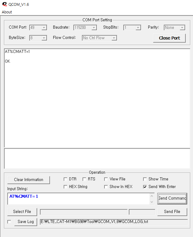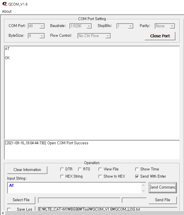 QCom 실행화면 아래와 같이 AT 입력 후 Send Command를 클릭하거나 Enter키를 눌러서 OK가 반환되는지 확인 합니다.