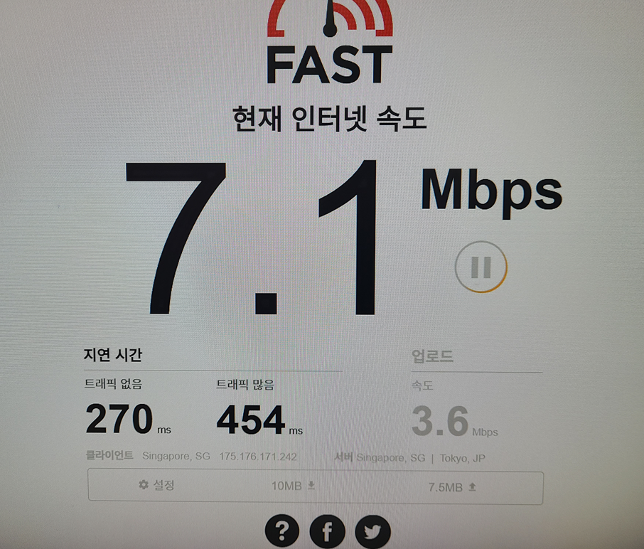 여러 번의 테스트를 진행했는데 다운로드 속도는 6.x ~ 7.x Mbps, 업로드 속도는 3.x ~ 4.x Mbps 측정되었습니다.