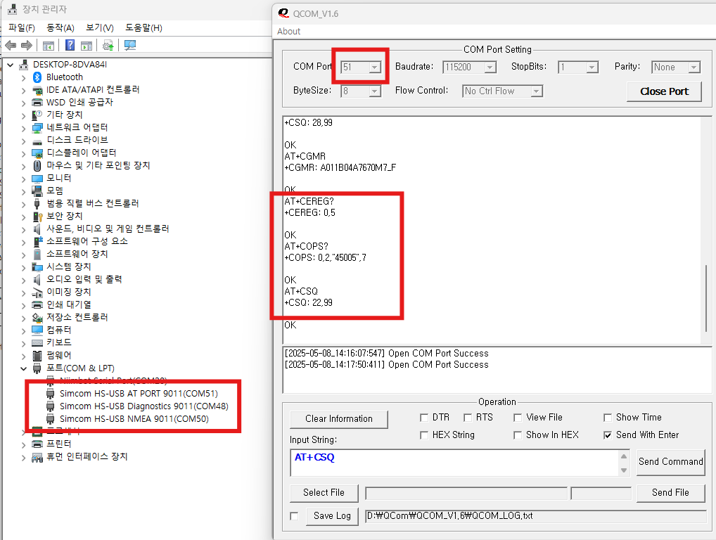 AT커맨드 테스트를 위해 AT PORT의 COM51을 QCOM 프로그램에서 오픈해서 통신모듈을 테스트했습니다.