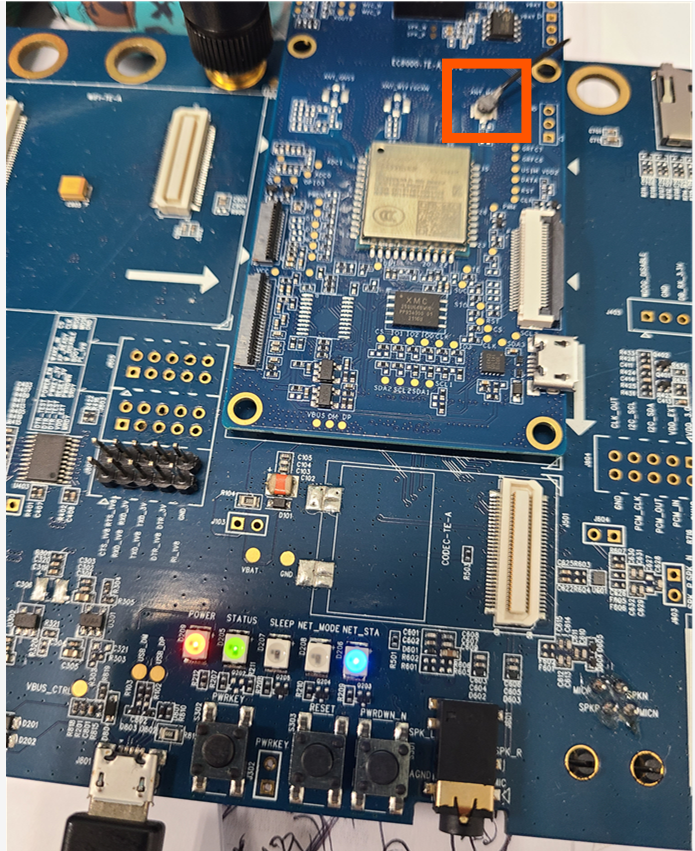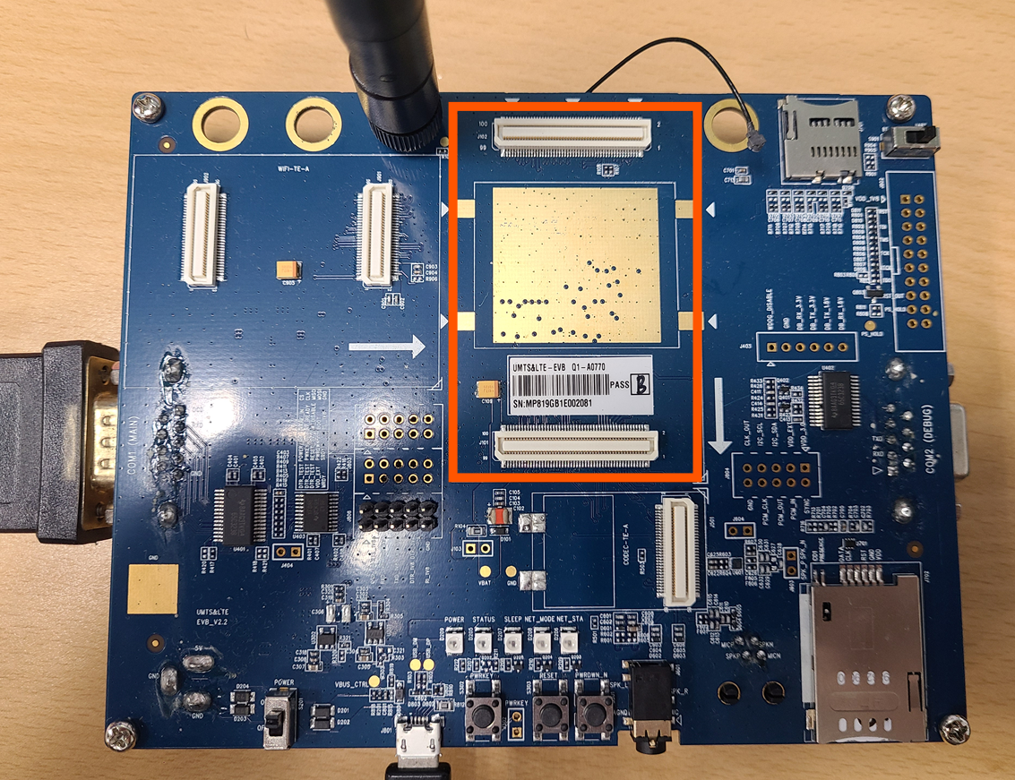 모듈보드는 Quectel EVM base-board의 아래 사각형 부분에 커넥터로 연결 합니다.