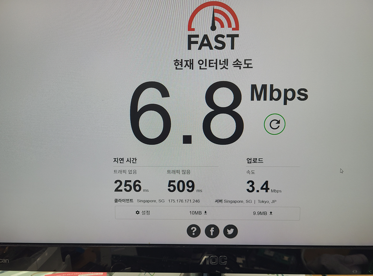 다운로드 6.8 Mbps, 업로드 3.4 Mbps 속도가 측정되었습니다.