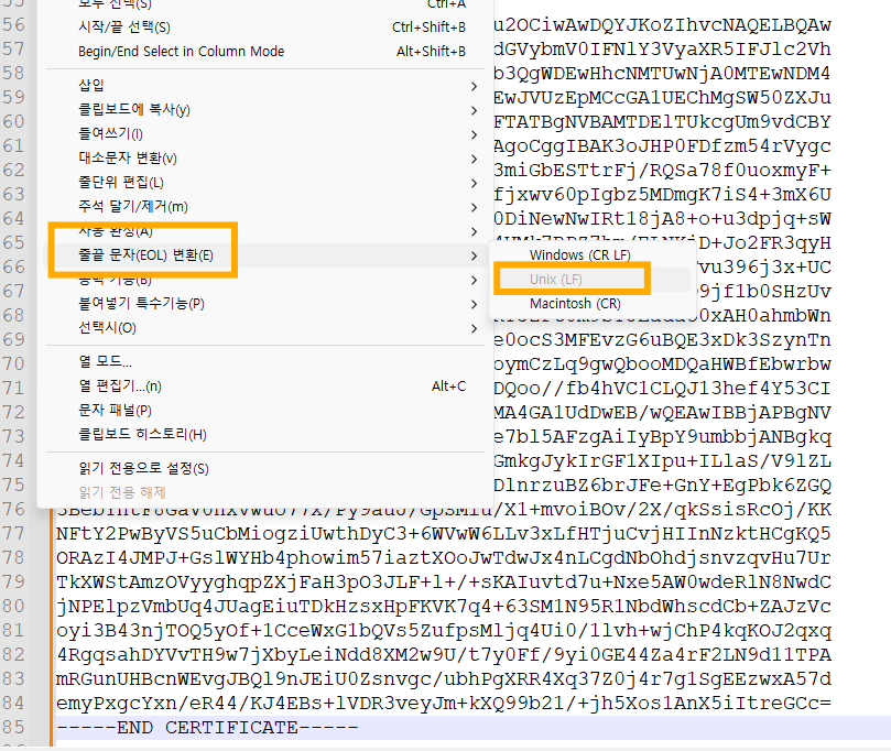 줄끝 문자(EOL) 변환시 Unix(LF) 타입을 선택해야 합니다. 기본값인 윈도 타입을 선택한 경우 캐리지리턴의 영향으로
