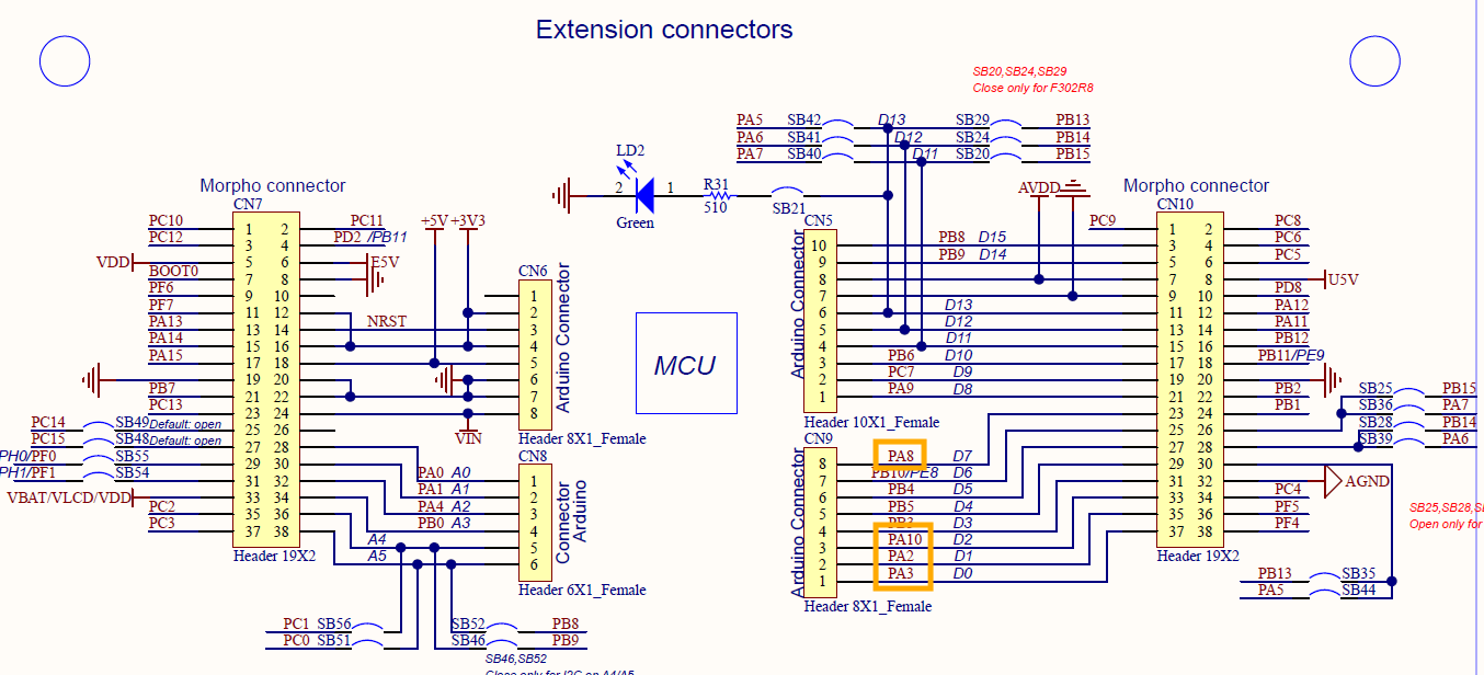D0, D1을 사용할 수 없어서 살펴보니 또다른 USART 채널을 사용할 수 있는 PA9, PA10이 아두이노 D8, D2핀에 각각 연결되어 있는 것을 위 회로도에서 확인할 수 있었습니다.