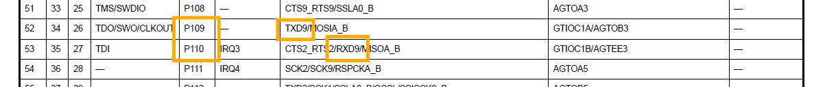 RA6E1 데이터시트를 찾아보면 P109는 TXD9로 P110은 RXD9로 사용할 수 있습니다.