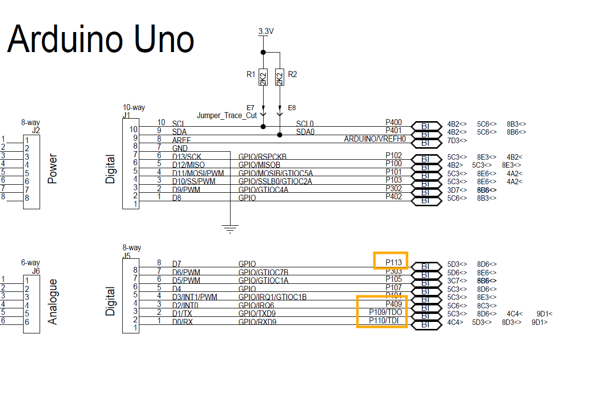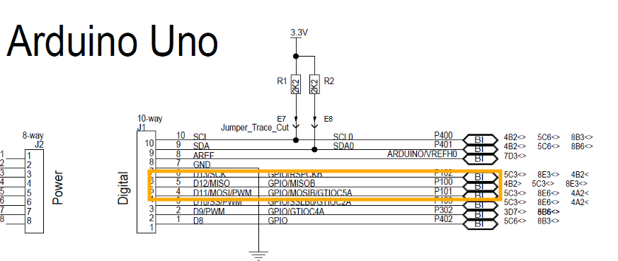 다른 보드들과 마찬가지로 D0, D1, D2, D7, 5V, GND, IOREF에 모뎀을 연결하려고 합니다. fpb-ra6e1 회로도를 살펴보면,