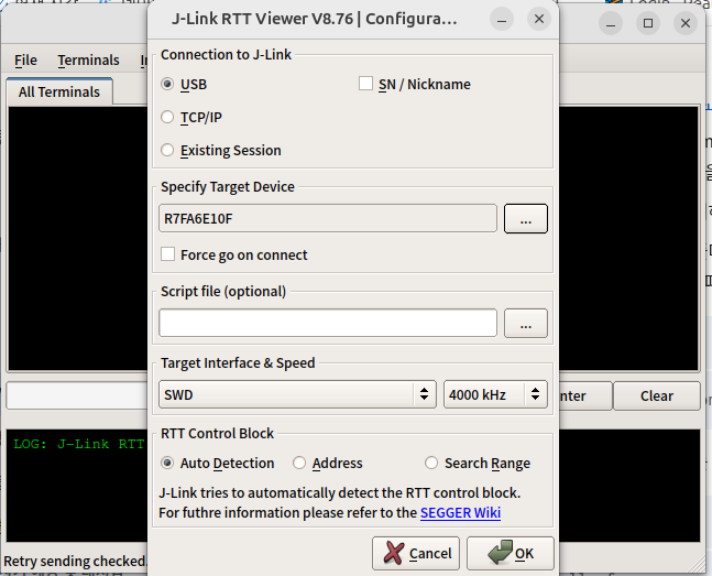 J-Link RTT Viewer 설정화면 모뎀 동작 설정파일 및 application 코드는 이전에 작업한 결과물을 그대로 사용할 계획입니다.