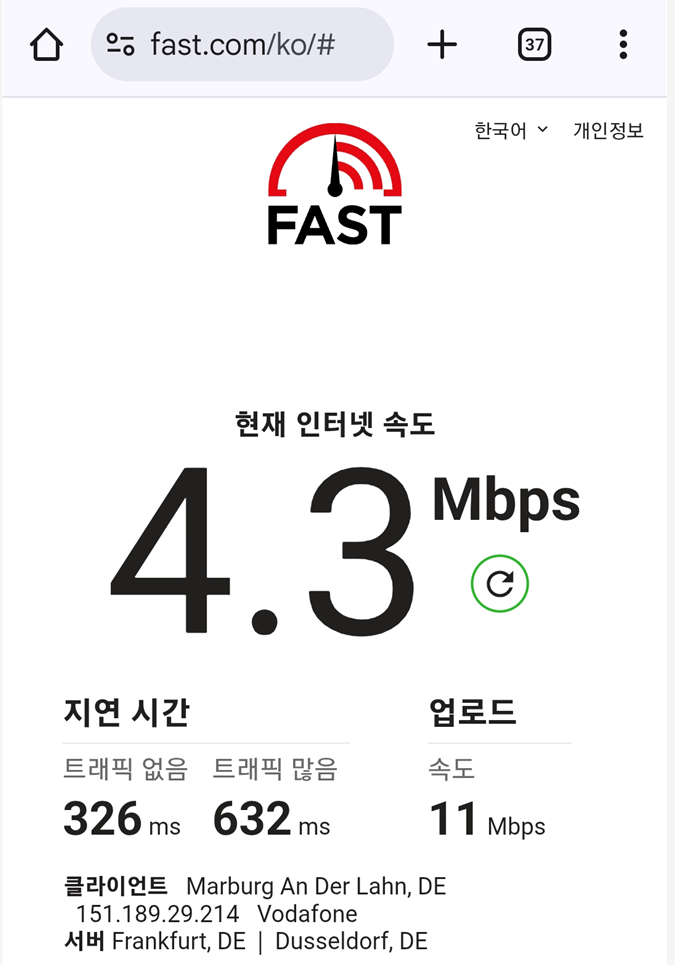 다운로드 4.3 Mbps, 업로드 11 Mbps 나왔습니다.