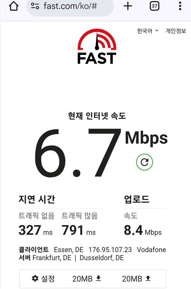 수동설정을 하지 않고 자동설정으로 Vodafone이 선택된 경우의 속도도 궁금해서 테스트해 보았습니다.
