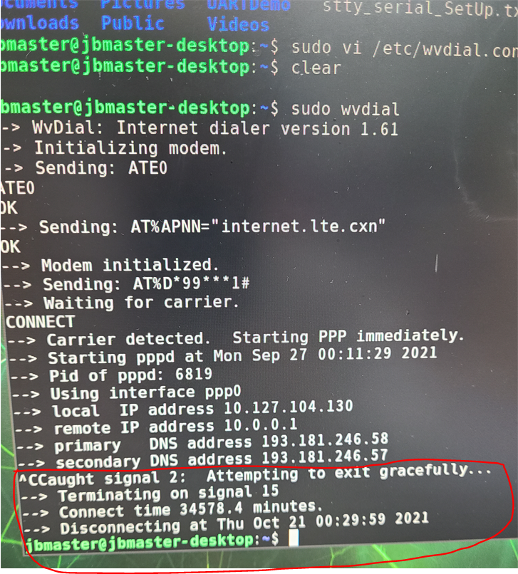 5) 이제 wvdial 프로그램을 실행합니다. 아래와 같이 기지국으로부터 IP를 할당받으신 것을 확인하실 수 있습니다.