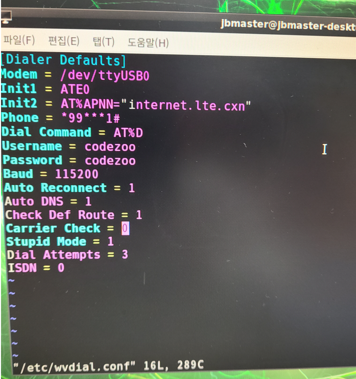 4) wvdial 설치가 완료되면 설정 파일을 수정합니다. 내용을 아래와 같이 수정하시고 APN 정보의 경우 사용하시는 APN 정보를 설정하셔야 합니다. (똑같이 따라 하시면 안 됩니다 ㅡㅡ;)