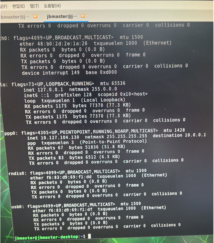 6) 이제 새로운 탭을 열어서 ifconfig 명령어를 실행해보면 ppp0 네트워크 장치를 확인하실 수 있습니다.