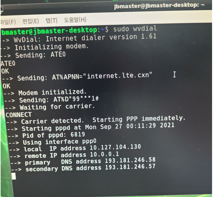 5) 이제 wvdial 프로그램을 실행합니다. 아래와 같이 기지국으로부터 IP를 할당받으신 것을 확인하실 수 있습니다.