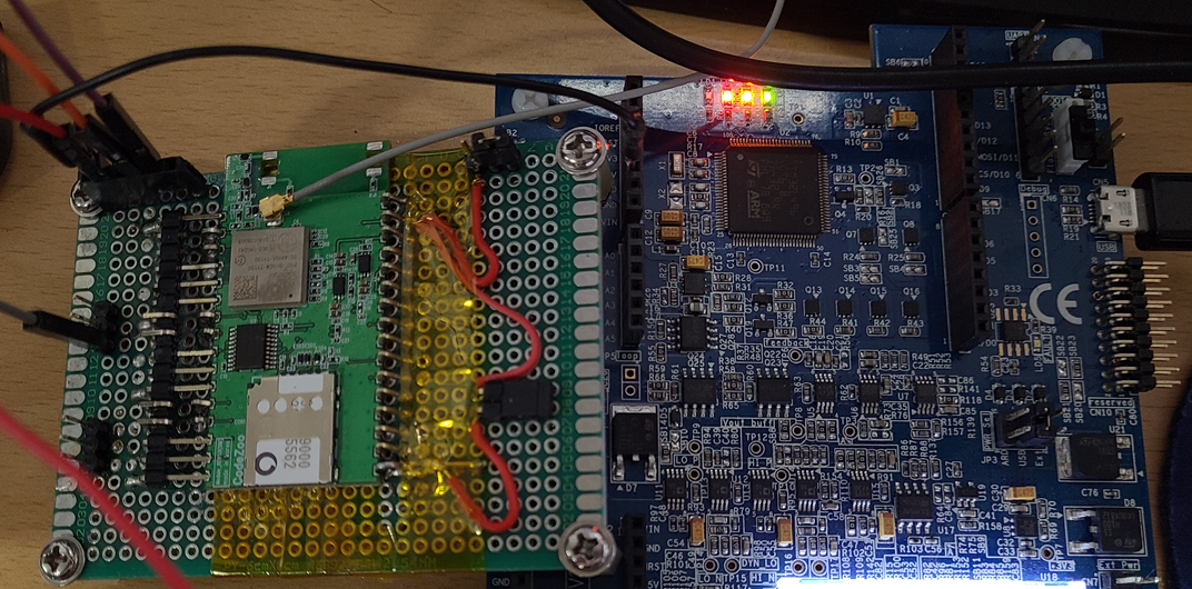 사용한 하드웨어는 글로벌심을 탑재한 LTE CATM1 내장형 모뎀, 테스트용 지그와 소모전류 측정을 위해 ST X-NUCLEO-LPM01A Power Monitor를 아래와 같이 연결 하였습니다.