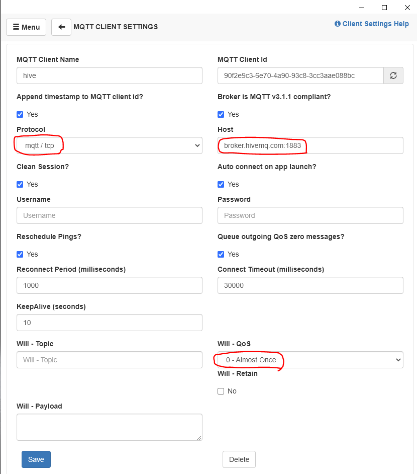 Protocol: mqtt/tcp, Host: broker.hivemq.com:1883, QoS 0 입력 및 선택 -> SAVE