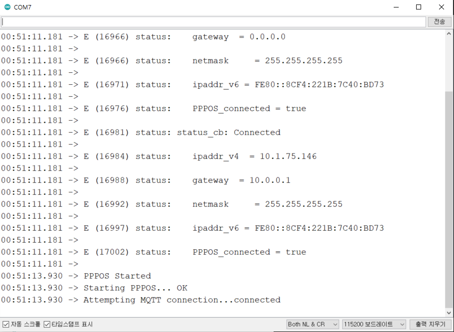 SIM이 정상적으로 설치되어 있고 APN 입력이 틀리지 않으면 아래와 같이 부팅 후 PPP모드로 전환해서 IP획득 후