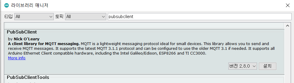 라이브러리 추가 pubsubclient를 입력하고 최신 버전을 설치합니다
