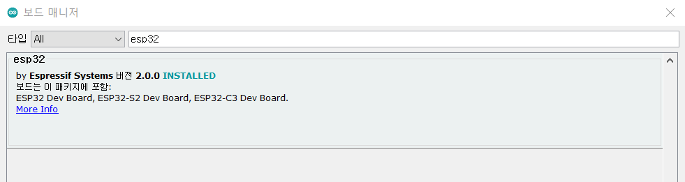 추가적인 보드 매니저 URLs 2. 설정 후 아두이노 스케치를 재시작하시고,툴 -> 보드 -> 보드 매니저에서 ESP32를 입력합니다.