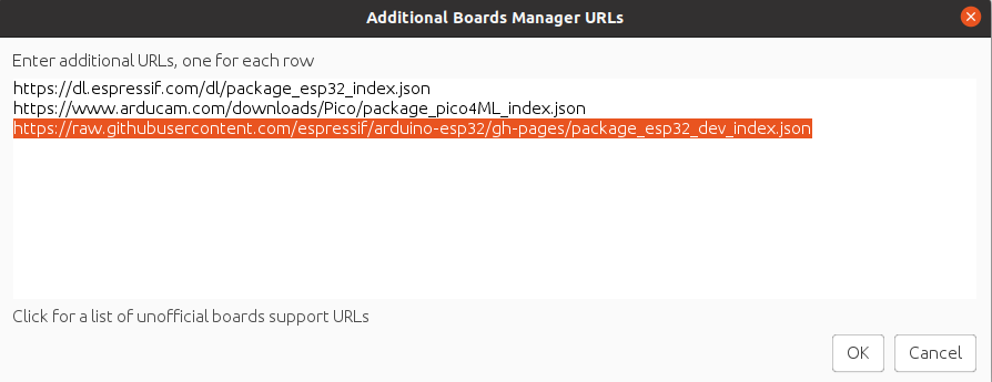LTE CATM1 하드웨어 PINOUT 1. 해당 보드를 아두이노에서 사용하기 위해서는 아래와 같이 보드매니저 정보를 업데이트 해야 합니다.스케치를 실행하고파일 -> 환경설정 -> 추가적인 보드 매니저 URLshttps://raw.githubusercontent.com/espressif/arduino-esp32/gh-pages/package_esp32_dev_index.json 입력 후 OK