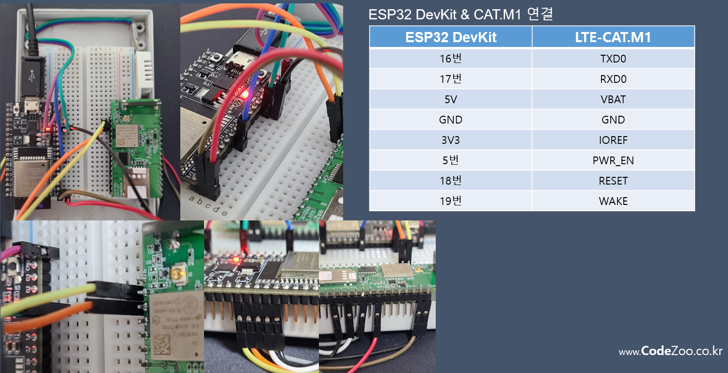 LwIP 프로토콜 구조 (출처: https://naudhizb.tistory.com/943) 해당 기술 기반으로 GSM을 PPP로 동작시키기 위해 제작된 PPPOS 프로젝트를 이용해서 CodeZoo LTE CATM1에서 동작하도록 작업했습니다.아시는 분도 계시겠지만, ESP32는 이미 ESP-IDF를 통해 FreeRTOS로 잘 구현 되어 있고, 네트웍 스택을 동작시키기 위한 LWIP를 포함한 소프트웨어 스택들이 잘 준비되어 있습니다.해당 기능을 최대한 이용해서 동작시키고, 그 위에 아두이노로 살짝 랩핑만 해두면 RTOS 시스템을 잘 모르시는 분들도 손쉽게 외부에서 접근해서 LTE CATM1을 통해 디바이스 제어가 가능합니다. ^^이제 작업 내용을 하나하나 정리해 보도록 하겠습니다.사용한 개발 보드 : ESP32 Devkit version40. 실습을 위한 하드웨어 구성아래와 같이 배선했고 LED 전구는 25번에 설치 했습니다.