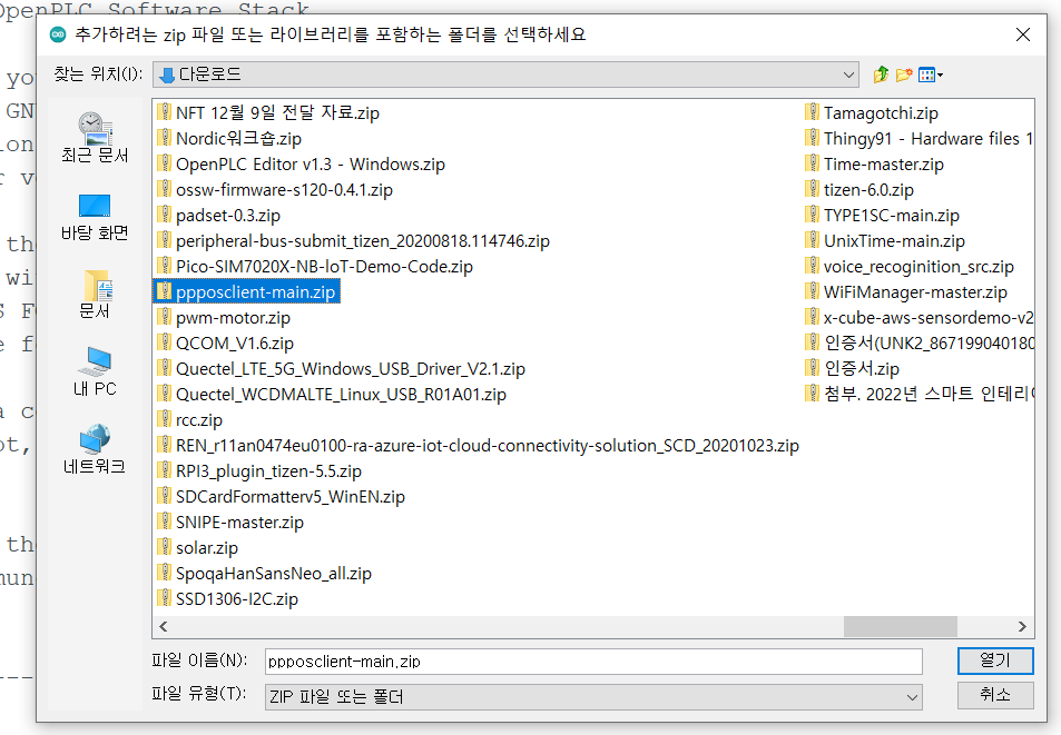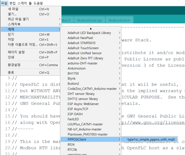 라이브러리가 추가되었습니다 4. 예제를 실행합니다. 예제 -> PPPOSClient -> type1sc_simple_pppos_with_mqtt