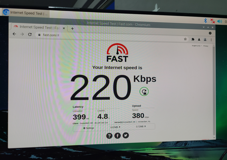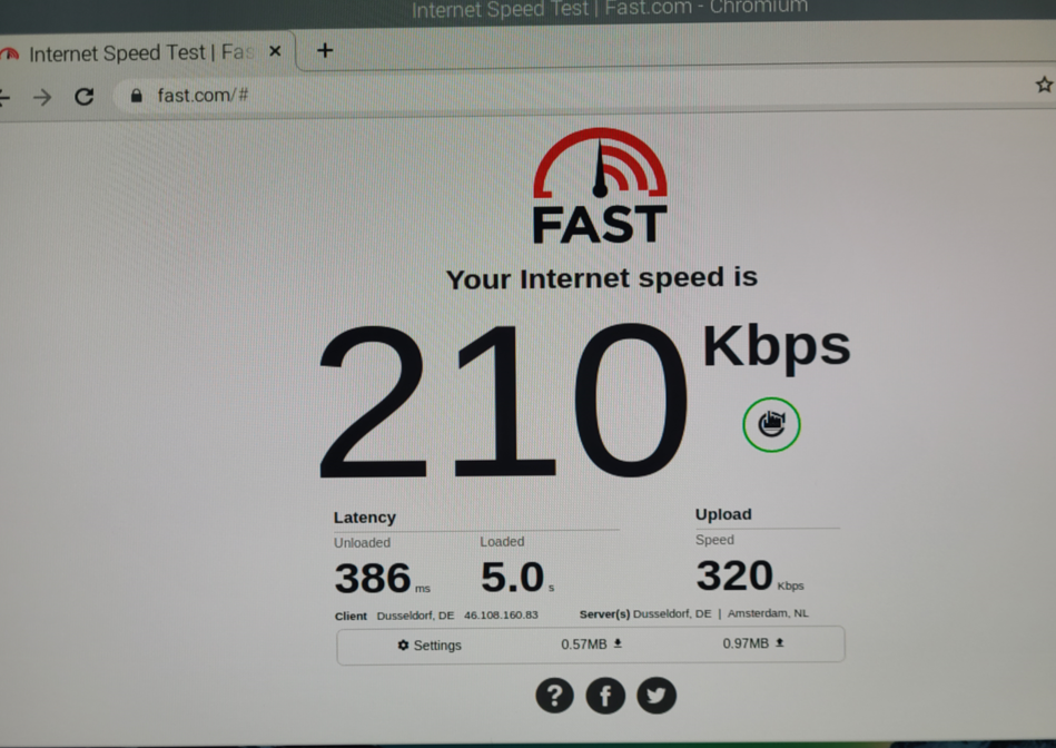 라즈베리파이 제로 W, 라즈베리파이 3B+, 라즈베리파이 4에서 모두 동일한 설정으로 PPP 모뎀으로 정상 동작 확인되었습니다. 테스트는 PPP 연결 후 핑 테스트, 파이썬 소켓통신 코드 테스트 후 내장된 크롬 브라우저를 이용해서 fast.com에 접속해서 속도 테스트 진행했습니다.