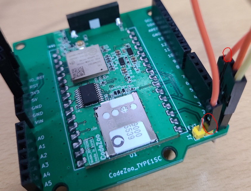 새로운 CATM1 실드 보드는 배선이 추가되었는데, 이전과 달리 아두이노 2번 핀을 Modem Reset에 연결해 두어서 Modem을 정상적으로 동작시키기 위해서는 2번 핀에 High 신호를 연결해야 합니다.