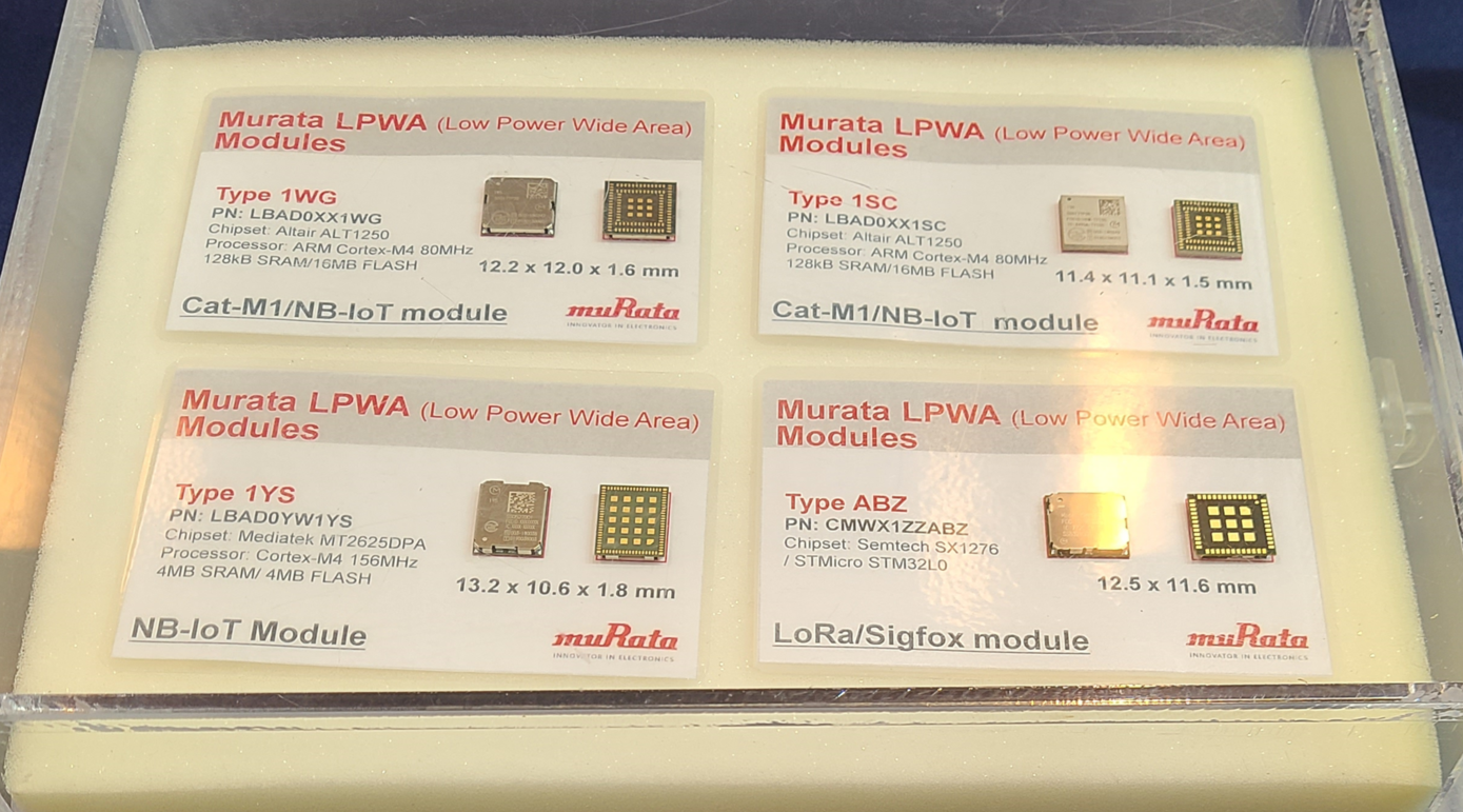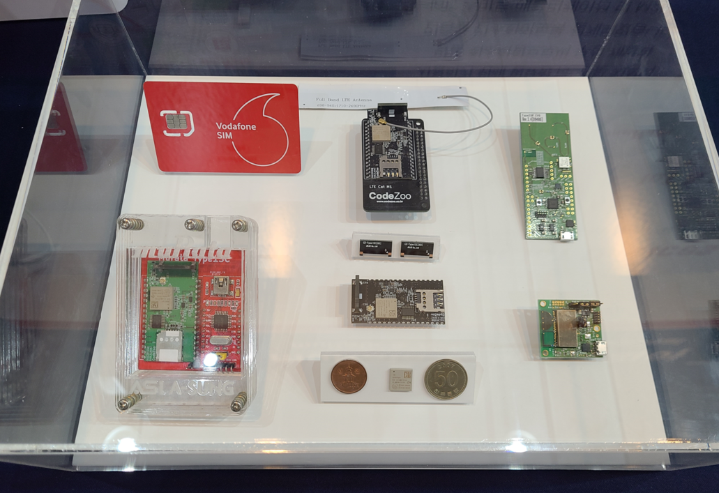 LTE CATM1 내장형 모뎀의 다양한 액세서리 결합 형태와 Murata UWB 보드, Murata LPWA 모듈, Vodafone SIM도 함께 전시했습니다.