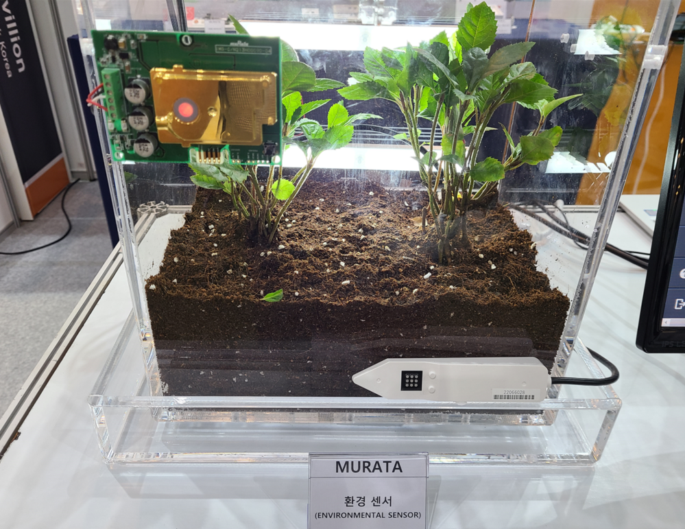 Murata 환경센서 IoT 스마트팜 시스템 전면(토양센서 1기는 토양에 매립, 1기는 전면에 전시)