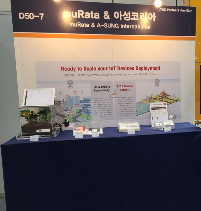AWS IoT SiteWise 머신텐딩 공정 실시간 분석 이전 작업했던 무라타 토양센서와 이산화탄소 센서 측정 결과를 LTE CATM1을 통해 AWS IoT Core로 보내서 분석하는 스마트팜 솔루션도 전시했습니다.