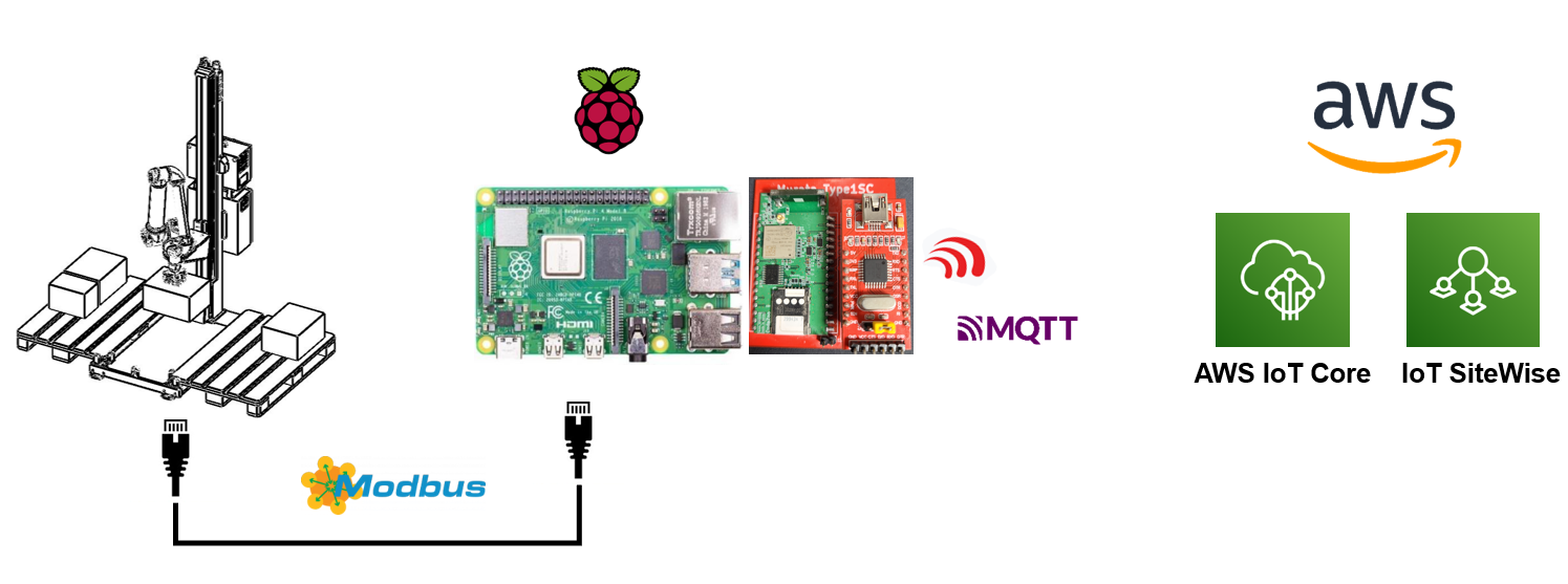 솔루션 소개영상 협동로봇에서 제공하는 실시간 작업 데이터와 로봇의 다양한 상태 데이터를 Modbus TCP를 통해 리눅스 보드에 전달하고 리눅스 보드에서는 해당 데이터를 수집, 가공하여 LTE CATM1 모뎀을 통해 AWS IoT Core로 전달하게 됩니다.