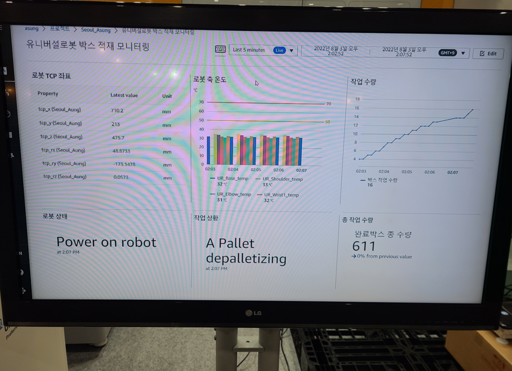 리눅스 시스템에 연결한 LTE CATM1 모뎀 협동로봇 팔레타이징 작업 결과는 아래의 AWS IoT SiteWise Portal 에서 실시간 확인이 가능합니다.