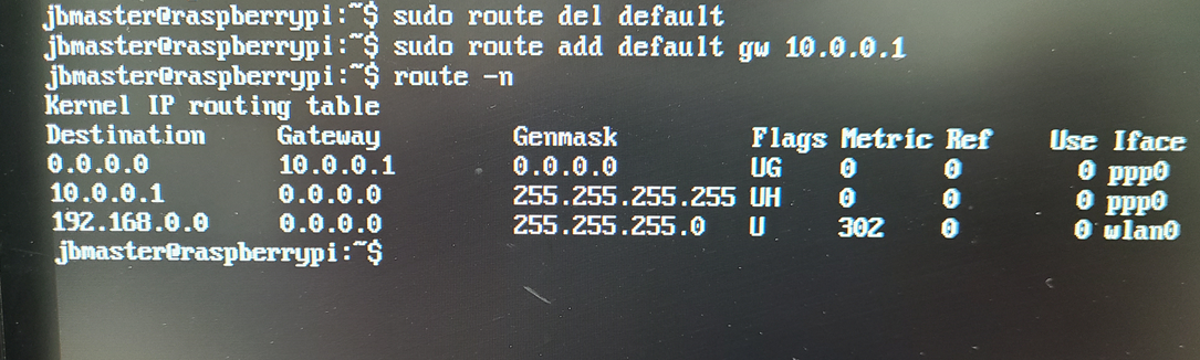 기존 default gateway를 삭제하고 ppp0(CATM1 내장형모뎀)이 사용하는 10.0.0.1로 default gateway를 설정했습니다.
