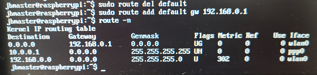 default gateway를 삭제하고 wlan0가 사용하는 192.168.0.1로 default gateway를 설정했습니다.