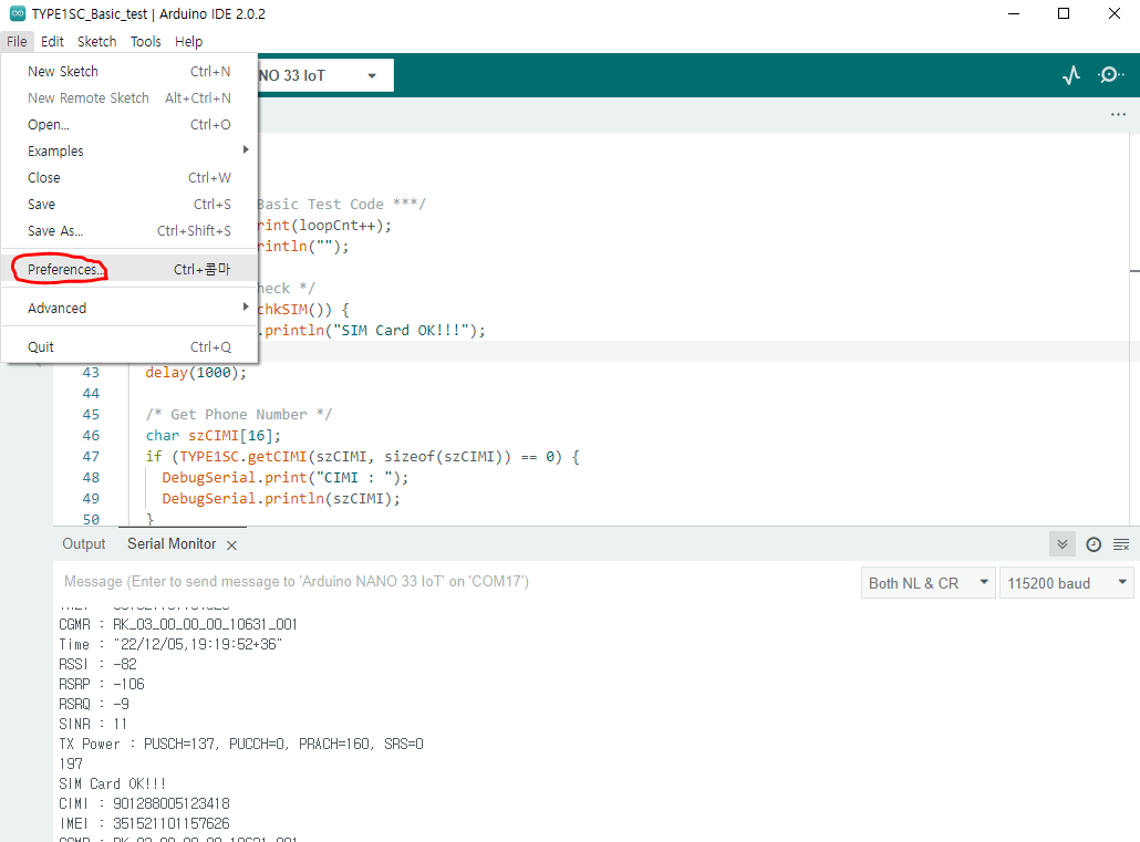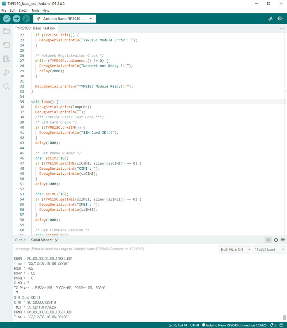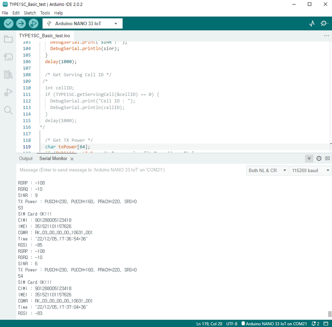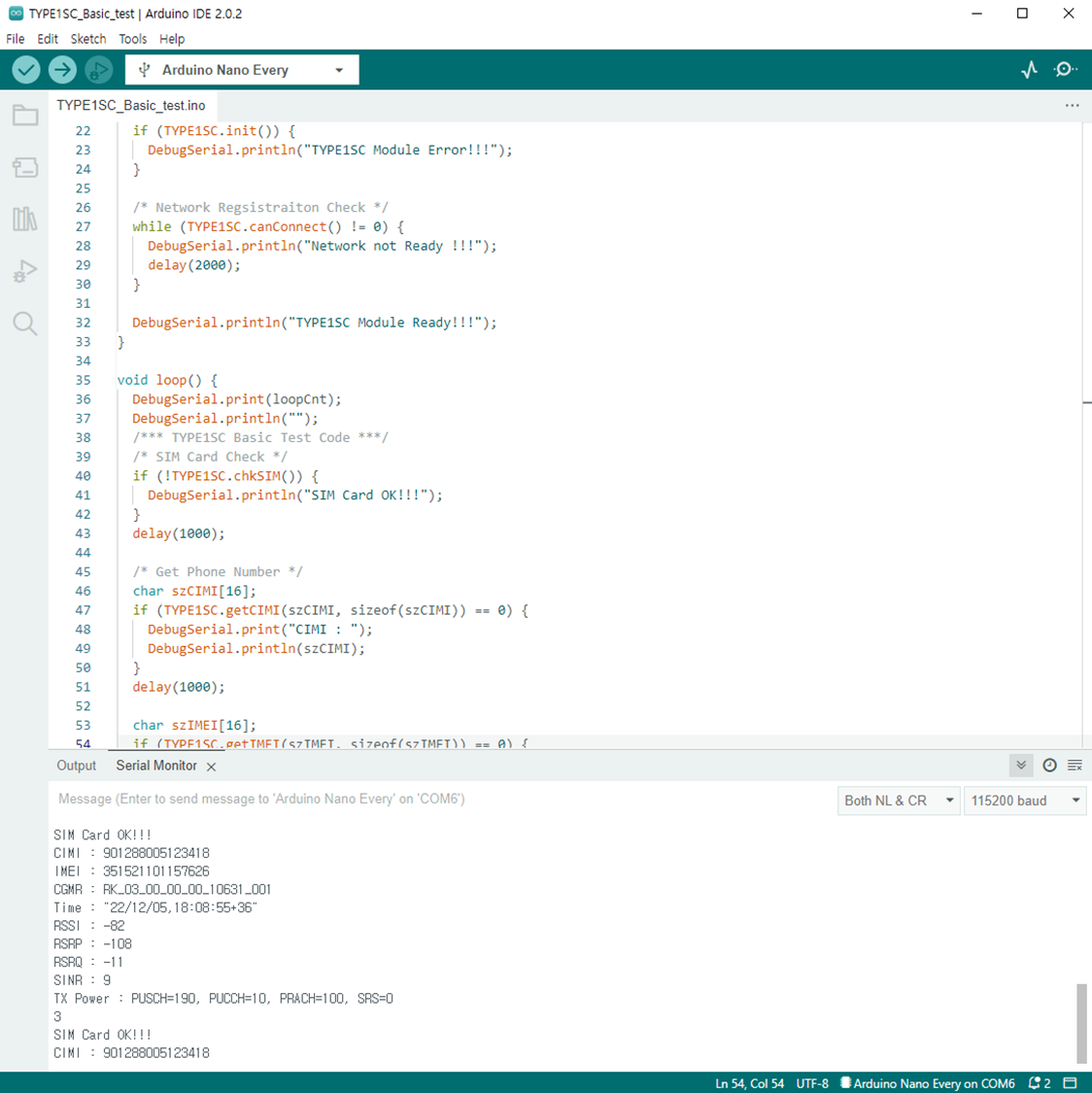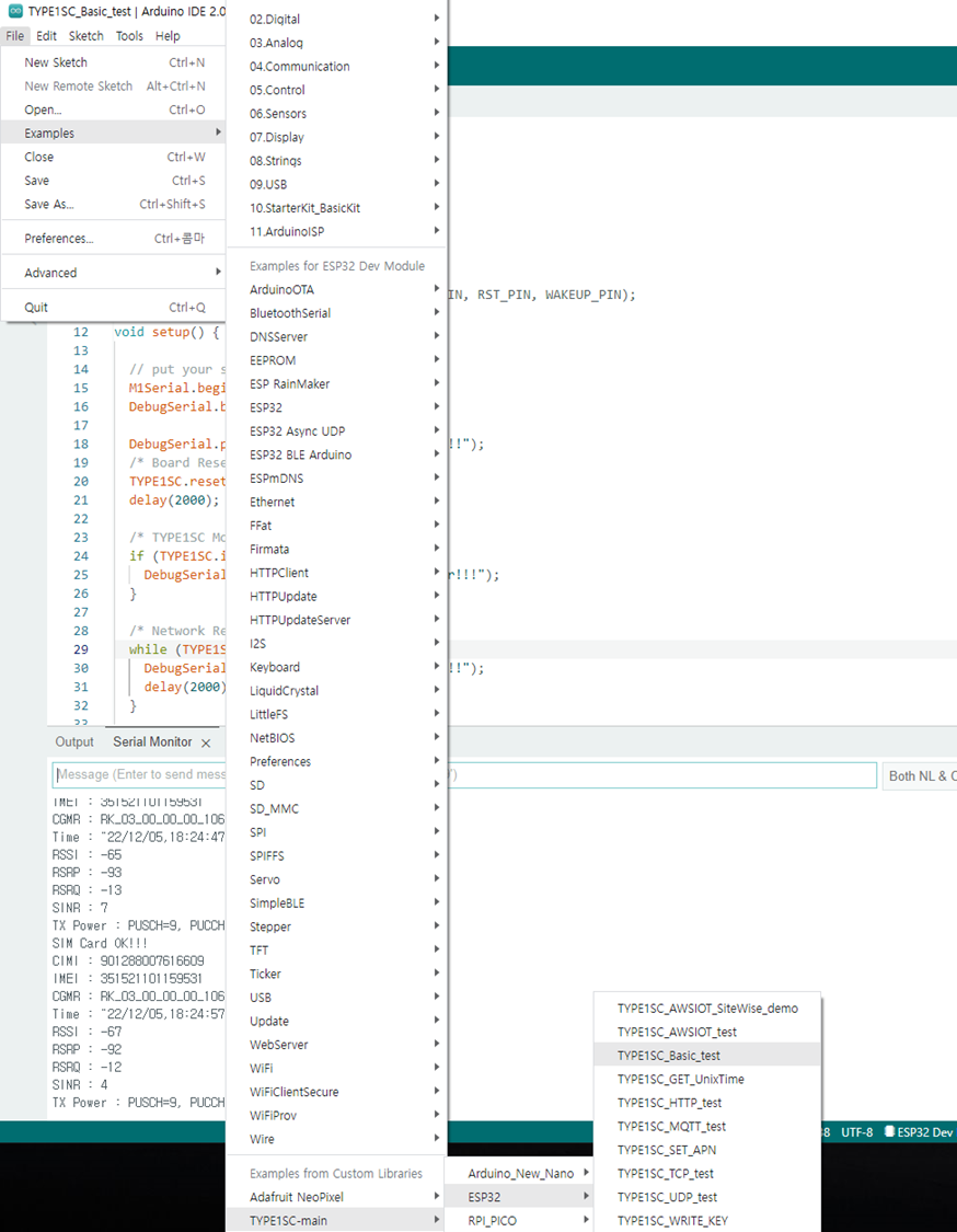 Library installed Arduino 예제를 선택합니다. 기지국과 연결 후 신호감도와 신호세기를 계속 모니터링하는 TYPE1SC_Basic_test를 선택했습니다.