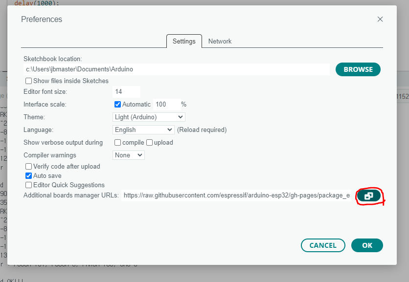 Additional boards manager URLs 입력을 위해 오른쪽 버튼을 누릅니다.