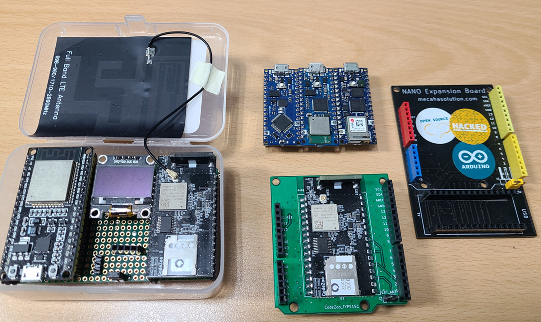 왼쪽부터 ESP32 DevBoard, Arduino Nano Every, Arduino Nano 33 IoT, Arduino Nano RP2040을 사용해서 테스트를 진행 했습니다. LTE CATM1 내장형 모뎀은 아두이노 쉴드 액세서리 보드와 나노 to 우노 확장 보드를 사용했습니다.