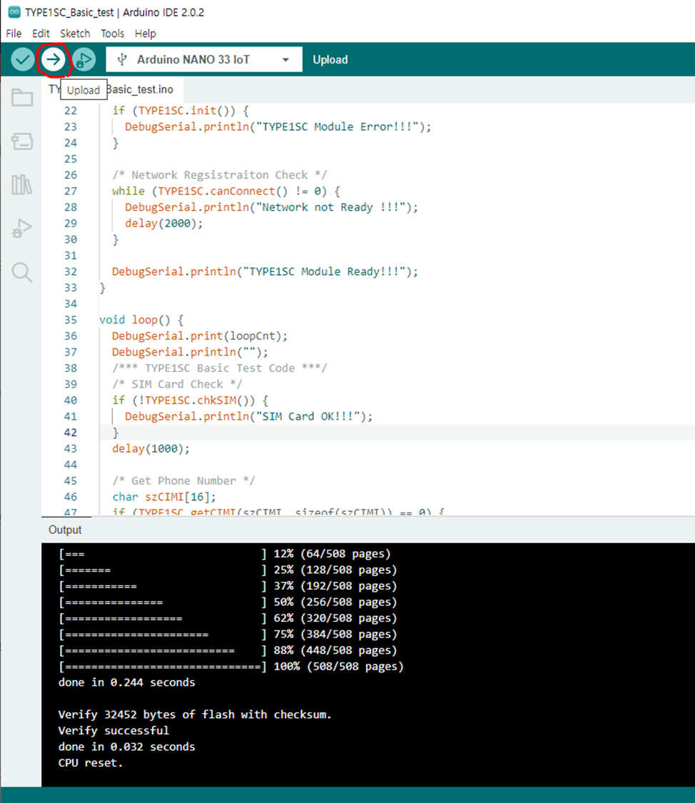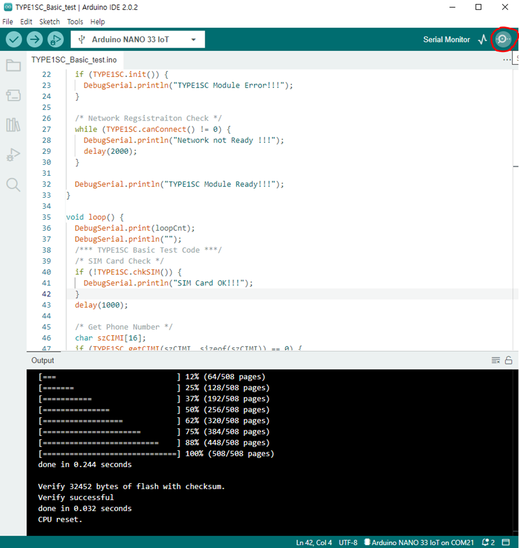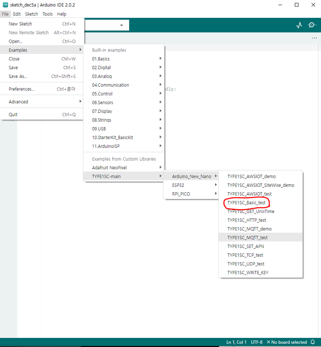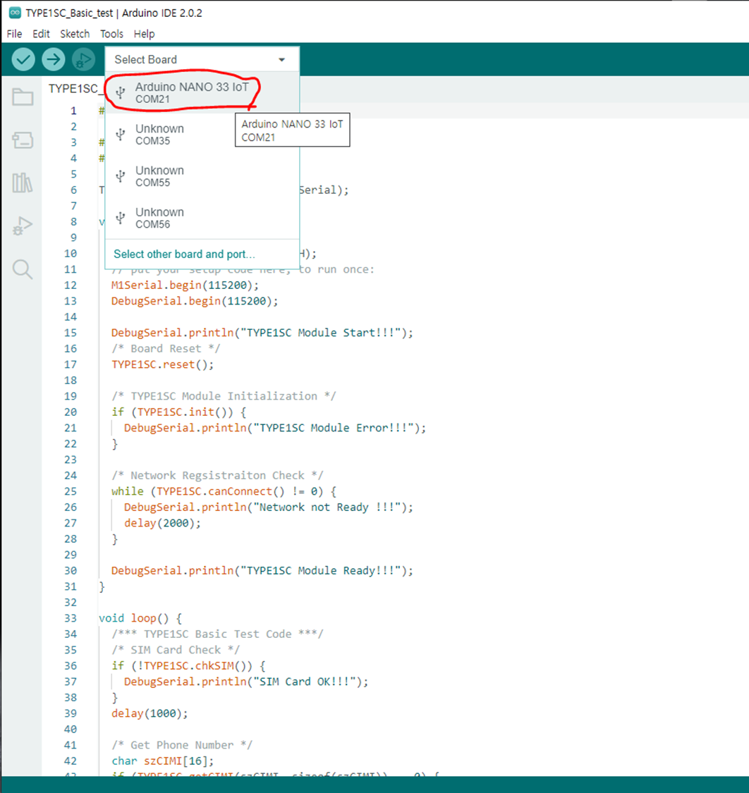 TYPE1SC-main --> Arduino_New_Nano --> TYPE1SC_Basic_test 예제 선택 아두이노에서 공식으로 지원하는 정품 보드의 경우 Select Board에 보드 이름과 포트가 출력됩니다.