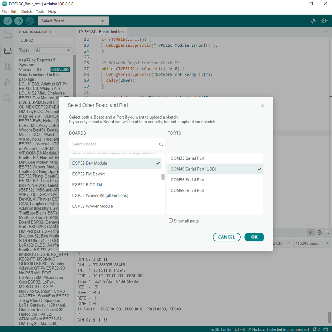 URL입력 후 OK버튼을 누릅니다. Upload 버튼 옆에 있는 Select Board 탭을 클릭해서 ESP32 Dev Module, Port를 선택합니다.