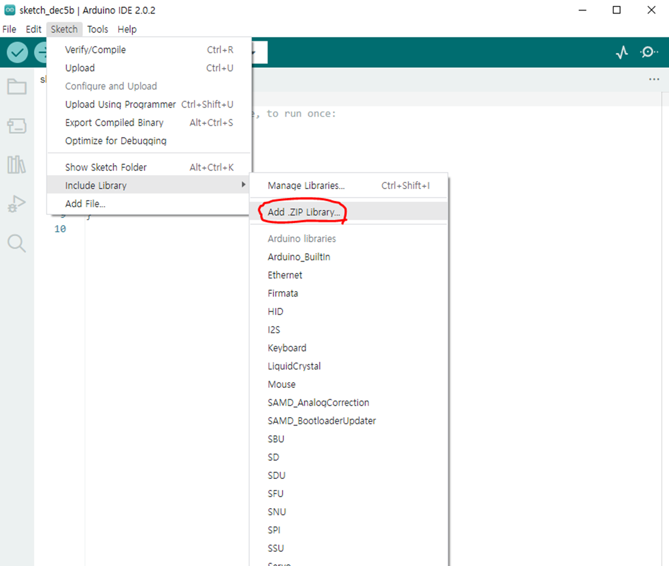 Code --> Download ZIP --> 내 다운로드 폴더에 ZIP파일 다운로드 이제 새로운 Arduino IDE 2.02를 실행해서 라이브러리를 설치 합니다.