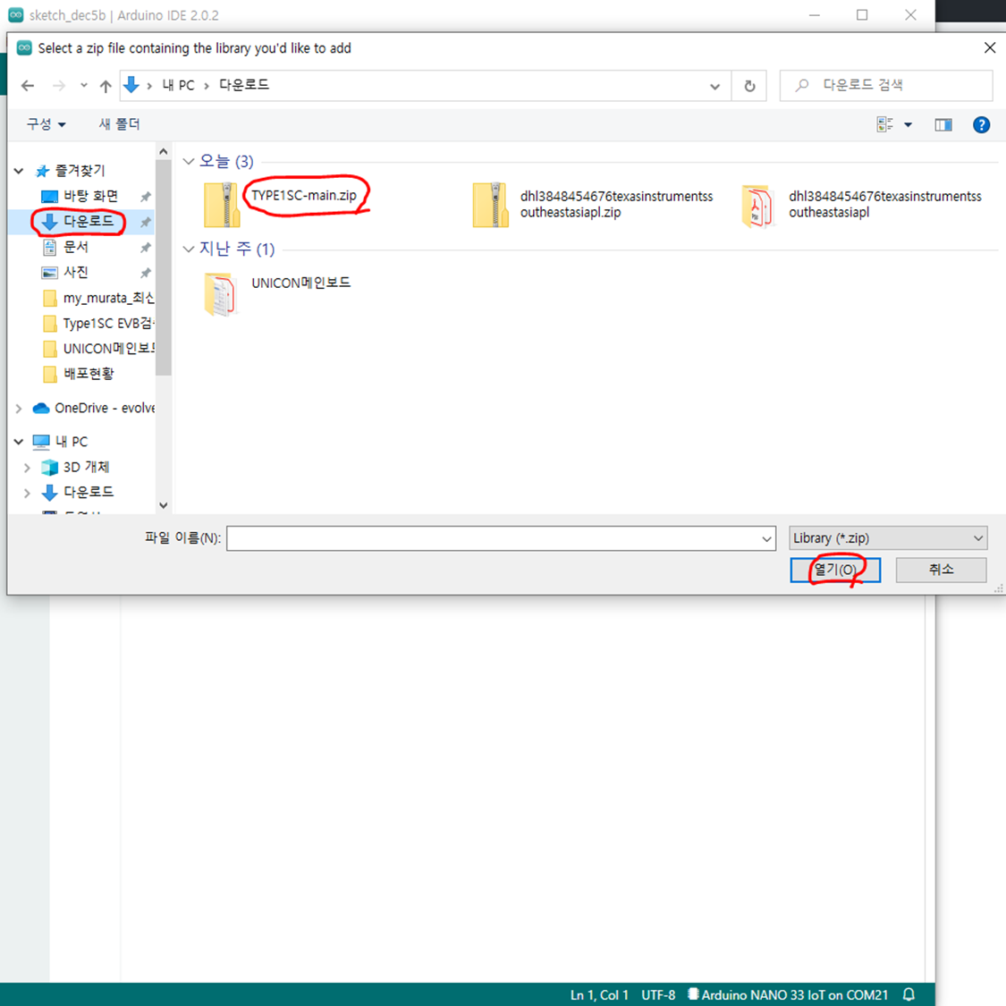 Sketch --> include Library --> Add .ZIP Library.. 실행 이전에 ZIP으로 받은 TYPE1SC-main.zip 라이브러리를 선택합니다. 기존에 동일한 이름이 있을 경우 파일명 뒤에 (1), (2) 덧붙여져 있으므로 주의합니다.