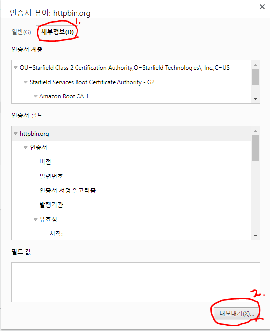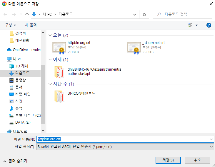 CATM1 모뎀에 서버에서 제공하는 인증서를 설치해야 하는데 먼저 웹브라우저에서 아래와 같은 방법으로 인증서를 다운로드 받습니다.