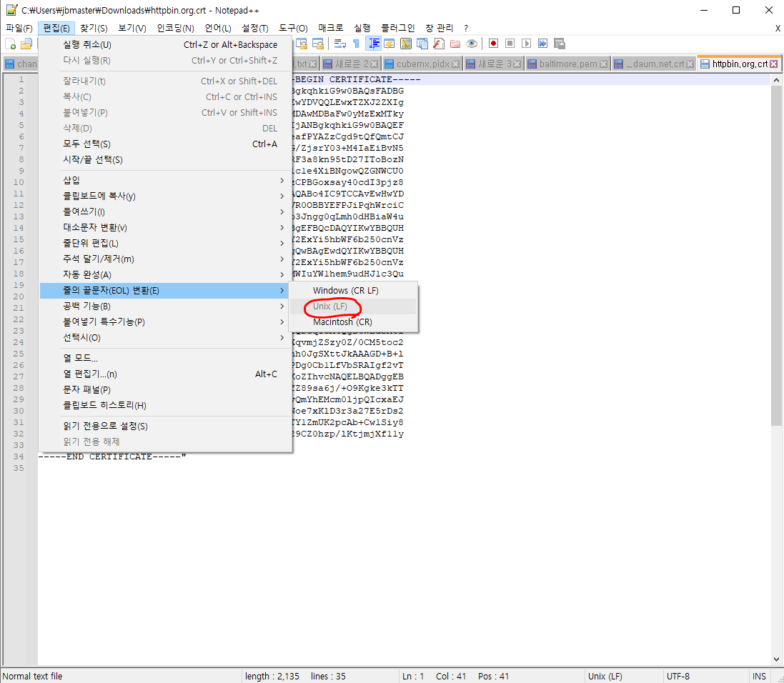 편집 --> 줄의 끝문자(EOL) 변환 --> Unix (LF) 클릭