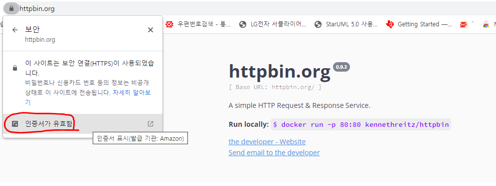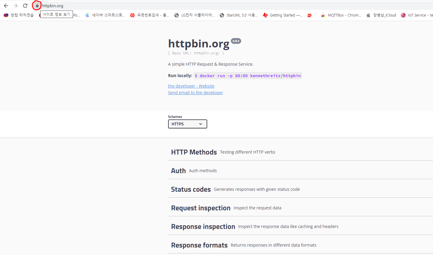 https://httpbin.org 웹사이트 화면 2. '이 사이트는 보안 연결(HTTPS)이 사용되었습니다.' 를 클릭 합니다.
