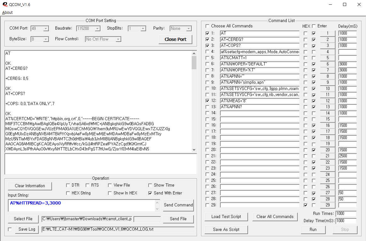 LTE CATM1 내장형 모뎀 AT커맨드는 아래와 같은 순서로 진행 했습니다. QCOM 프로그램을 사용해서 진행 했습니다.