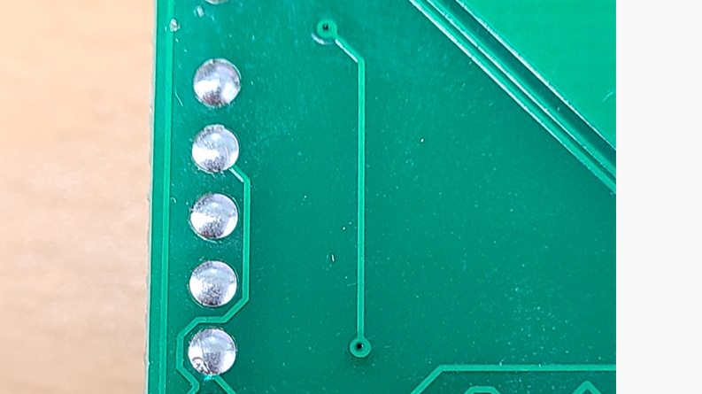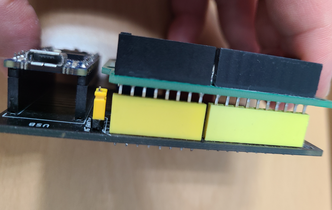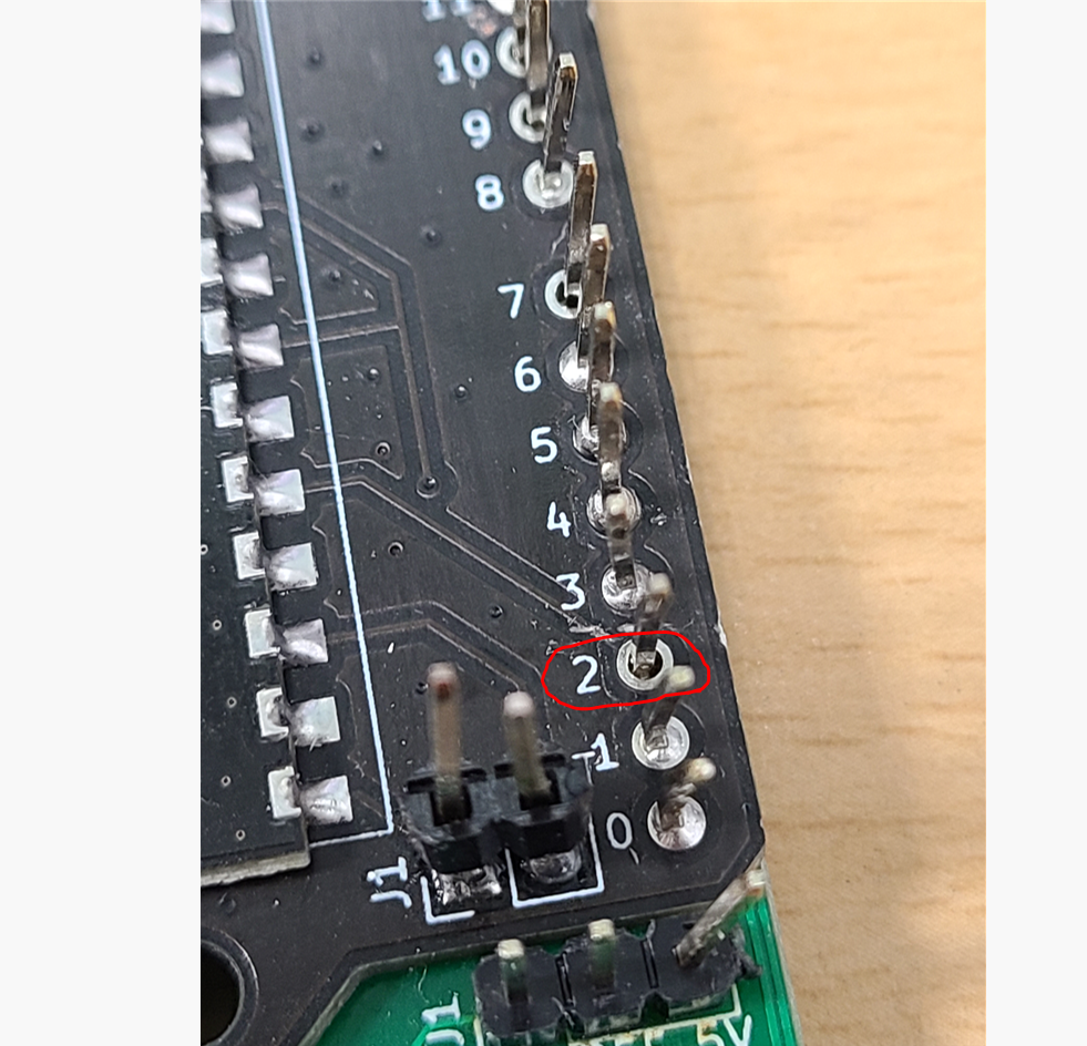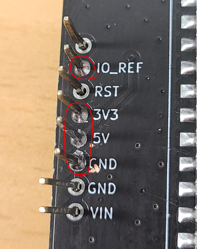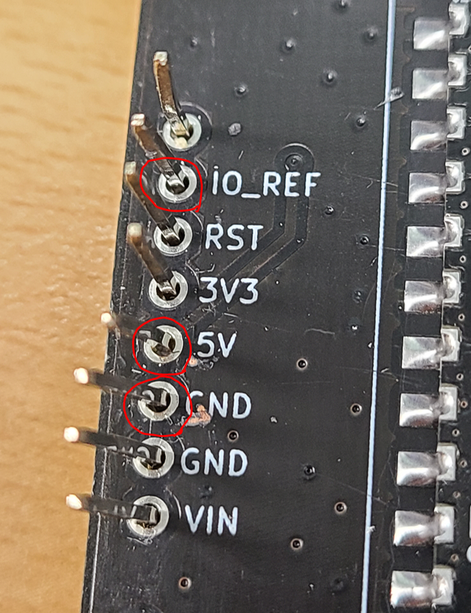 해당 보드에서 Arduino Nano 33 IoT 보드와 IOREF 연결하는 부분을 살펴보면 핀헤더가 통과한 후 솔더링으로 고정된 것을 확인할 수 있습니다. 하지만, 아래 아두이노 실드 사진은 핀헤더가 통과한 흔적이 없습니다.