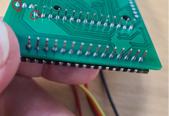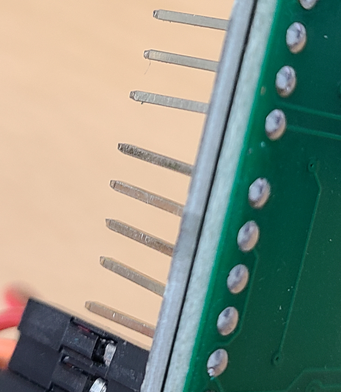 핀헤더 윗부분을 덮고 있는 가이드를 제거하고 내부를 확인해 보니 실제 모뎀 전원, 그라운드, 모뎀 리셋 I/O를 연결하는 핀헤더들이 모두 솔더링이 되어 있지 않았습니다. 이 부분은 이전에도 한번 겪었던 일인데, 이렇게 핀헤더를 쓰루홀(헤더 구멍)을 통과시키지 않고 납으로 바깥쪽에서 구멍만 막는 경우 테스터기로는 신호가 연결되었다고 나오지만,