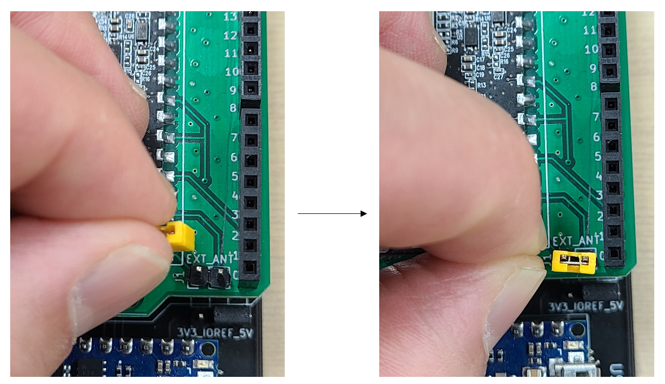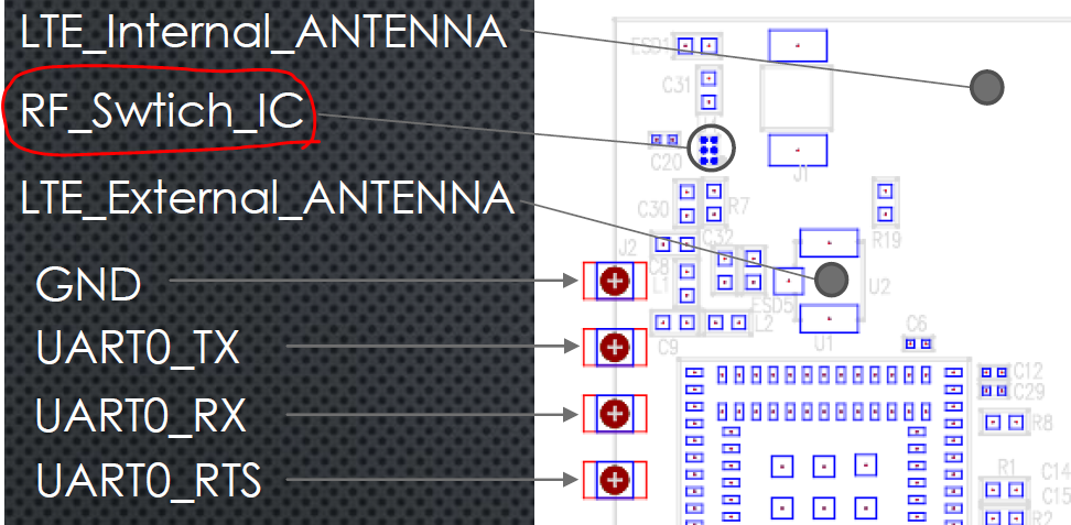 아래 그림과 같이 LTE CATM1 내장형 모뎀 32번핀 (EXT_ANT)에 GPIO 신호로 Pull-up(Logic High)을 인가하면
