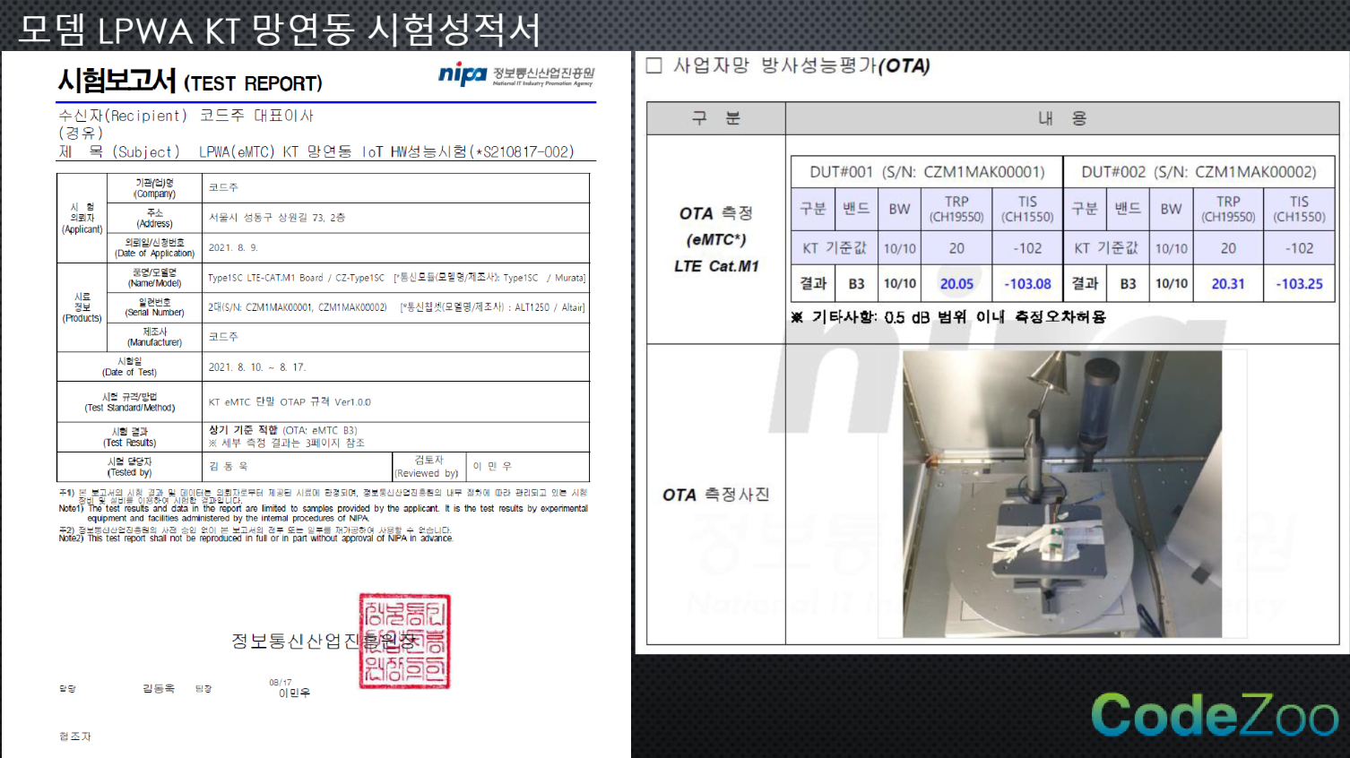 먼저 LTE CATM1 내장형 모뎀은 내장안테나를 사용해서 nipa 시험 테스트를 통해 아래와 같이 시험성적서를 발부받았고 기준 적합 판정을 받았습니다.