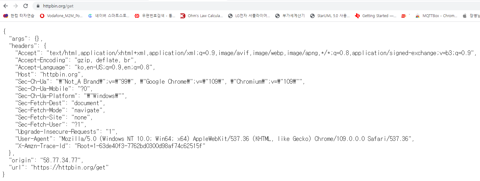 웹브라우저로 (https://httpbin.org/get)에 접속해서 데이터를 읽어 온 화면