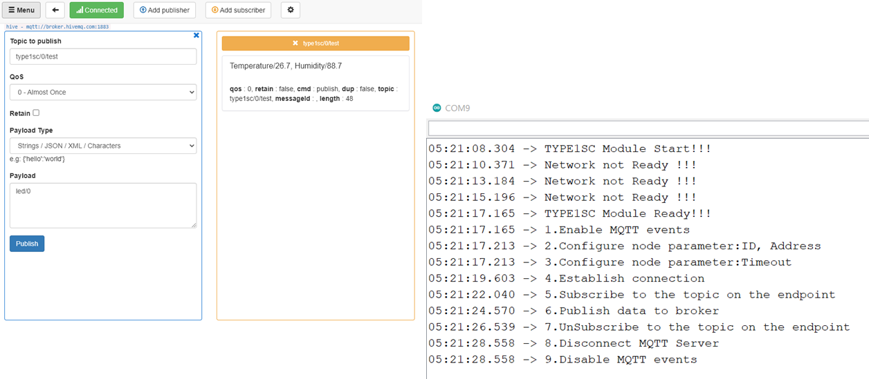 3. MQTT : HiveMQ Broker 와 연동해서 구독한 노드에 온도, 습도데이터를 발행
